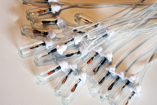 materials: glass, copper, solar engine, motor, tubing, cotton gauze, mineral oil